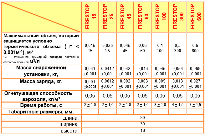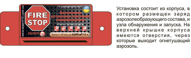 Автономные установки (системы) аэрозольного пожаротушения FIRESTOP применяются для противопожарной защиты электрического и электронного оборудования, напряжением до 35 кВ, расположенного в локальных объемах (шкафах, электрошкафах, электрощитовых, распределительных щитах, нишах, каналах, отсеках, серверах, серверных помещениях и т.п.); оборудования транспортных средств (автомобилей, железнодорожных локомотивов и вагонов, воздушных и морских судов), расположенное в локальных объемах (шкафах, моторных и технических отсеках, трюмах, контейнерах и т.п.); содержание банковских хранилищ, сейфов, ячеек, которая действует как автоматический аєрозольный огнетушитель.