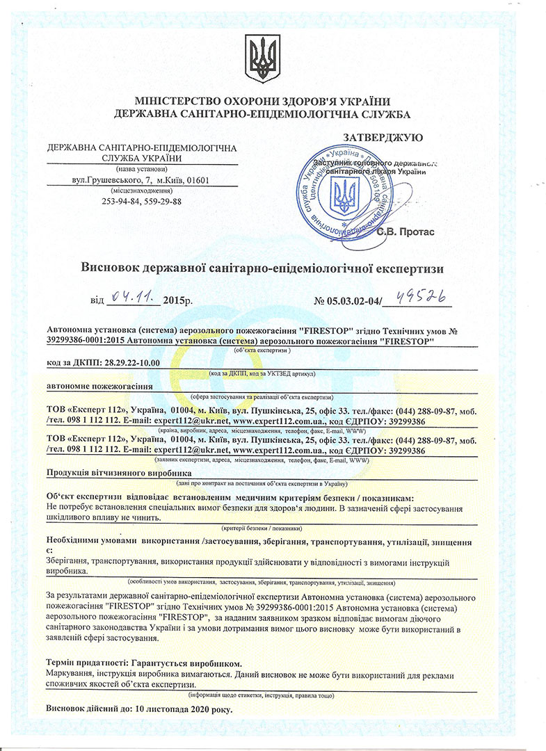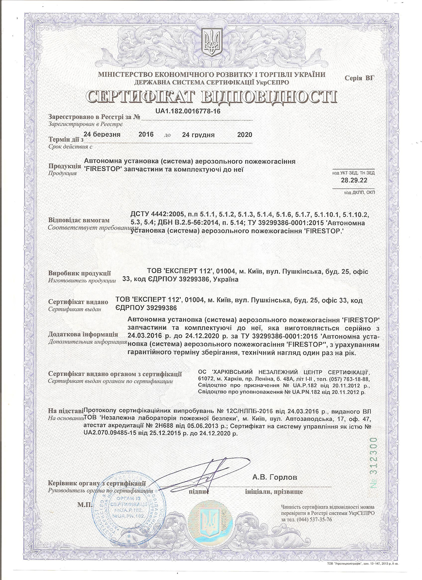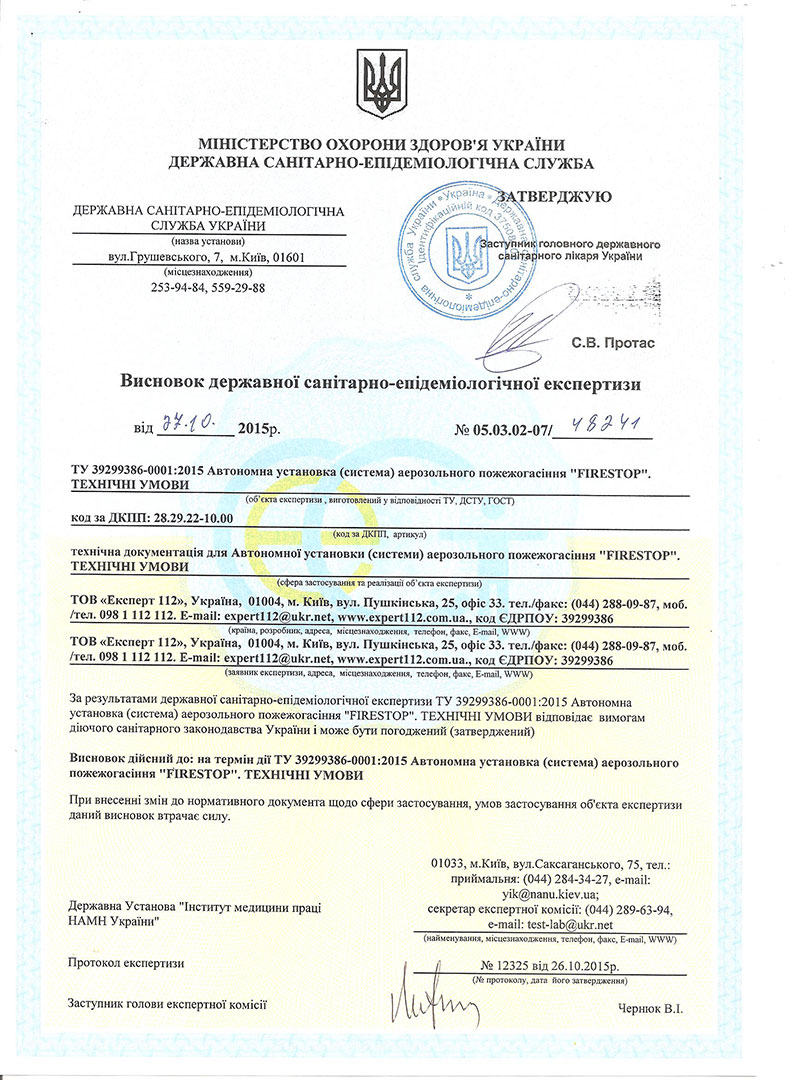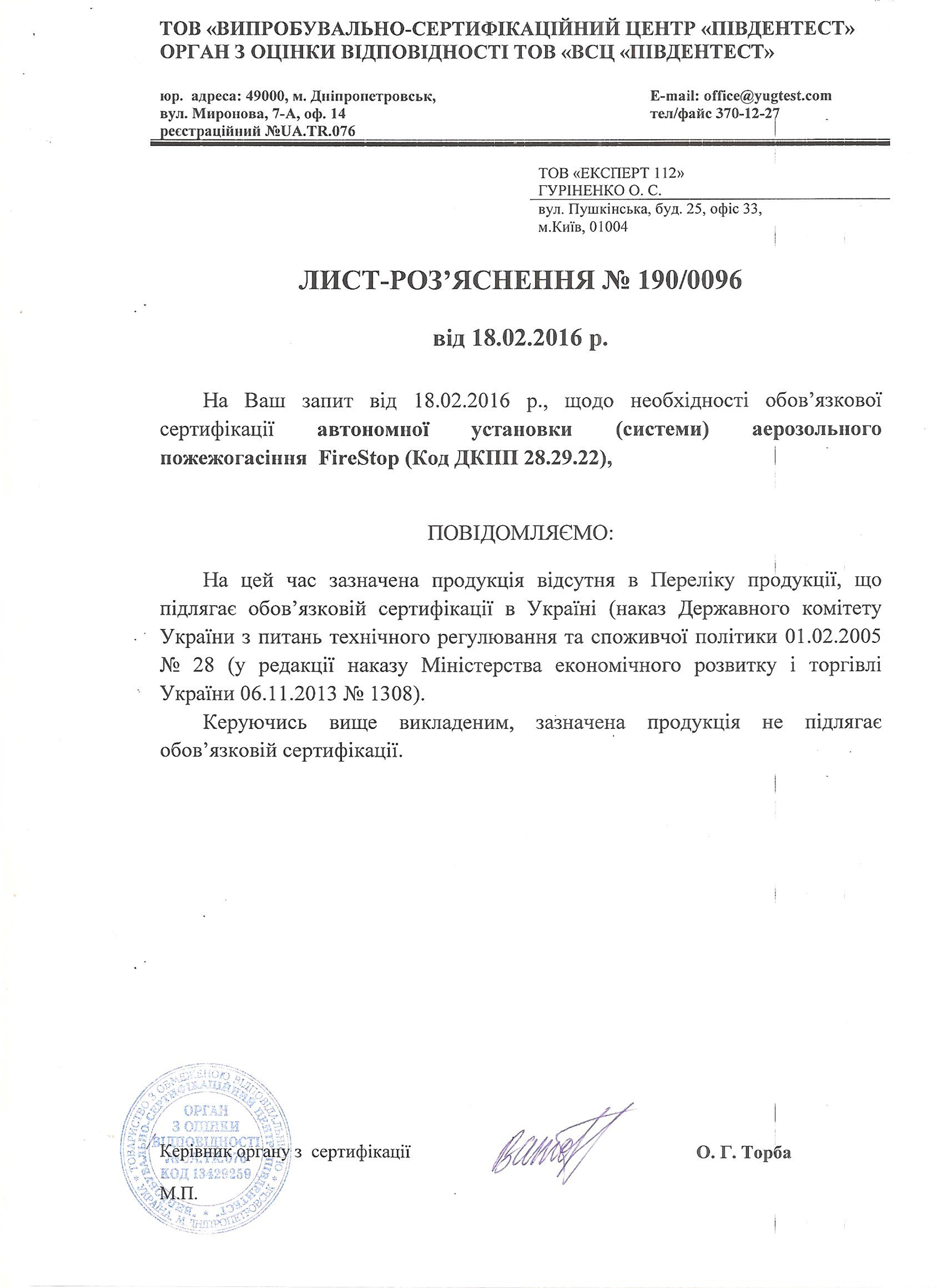 Установка FireStop не подлежит обязательной сертификации в соответствии с "ПЕРЕЧНЕМ ПРОДУКЦИИ, ПОДЛЕЖАЩЕЙ ОБЯЗАТЕЛЬНОЙ СЕРТИФИКАЦИИ В УКРАИНЕ" от 1 февраля 2005 N28