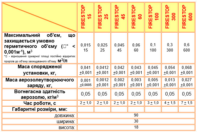 Автономні установки (системи) аерозольного пожежогасіння FIRESTOP застосовуються для протипожежного захисту електричного та електронного обладнання, напругою до 35 кВ, розміщеного в локальних об’ємах (шафах, електрошафах, електрощитових, розподільних щитах, нішах, каналах, відсіках, серверах, серверних приміщеннях і т.п.); устаткування транспортних засобів (автомобілів, залізничних локомотивів і вагонів, повітряних і морських суден), розміщене в локальних обсягах (шафах, моторних і технічних відсіках, трюмах, контейнерах і т.п.); вміст банківських сховищ , сейфів, комірок, який діє як автоматичний аерозольний вогнегасник.