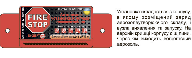 "FIRESTOP" є автономною системою пожежогасіння локального застосування (СПГа) та інтелектуальним засобом об'ємного пожежогасіння і виконує