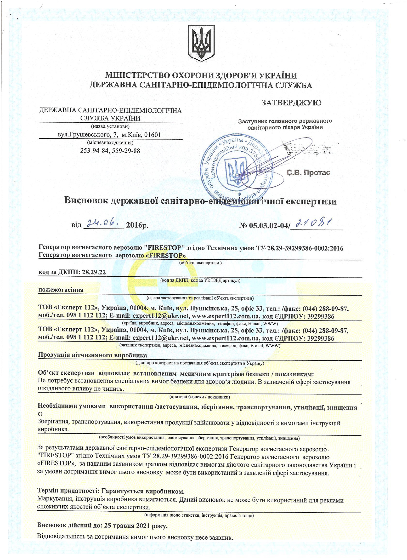 Установка FireStop не подлежит обязательной сертификации в соответствии с "ПЕРЕЧНЕМ ПРОДУКЦИИ, ПОДЛЕЖАЩЕЙ ОБЯЗАТЕЛЬНОЙ СЕРТИФИКАЦИИ В УКРАИНЕ" от 1 февраля 2005 N28